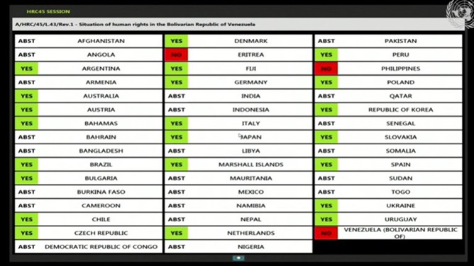 Por 22 votos a favor, 22 abstenciones y 3 votos en contra se impuso la posición de la mayoría de los países reunidos en el Consejo de Derechos Humanos de la ONU y quedó aprobada la resolución que insta a Venezuela a atender las denuncias sobre las violaciones de derechos humanos que se equiparan a delitos de lesa humanidad.