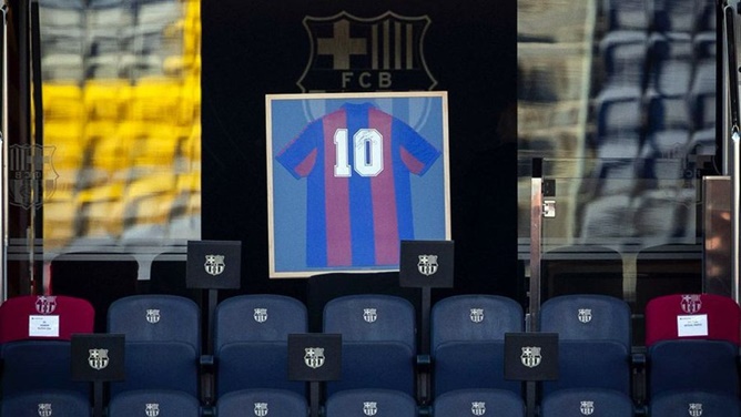 En el centro del Camp Nou se colocó una camiseta con el número 10 y una pelota y en la platea también hubo que firmó el propio Diego, quien jugó en los '80