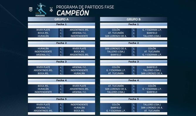 Esto se estableció tras el sorteo de la Fase Campeón que se realizó en un hotel céntrico, y en donde quedó establecido que Boca y River integran el Grupo A junto a Huracán, Independiente, Arsenal y Argentinos Juniors.