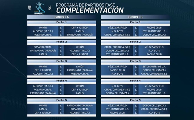 La Fase Complementación (integrada por los equipos que terminaron 3° y 4° en cada grupo de la primera etapa) estará conformado por: Grupo A: Aldosivi; Rosario Central; Patronato;Lanús; Defensa y Justicia; Unión; El Grupo B :Newell's Old Boys; Central Córdoba; Godoy Cruz; Estudiantes; Racing y Vélez.