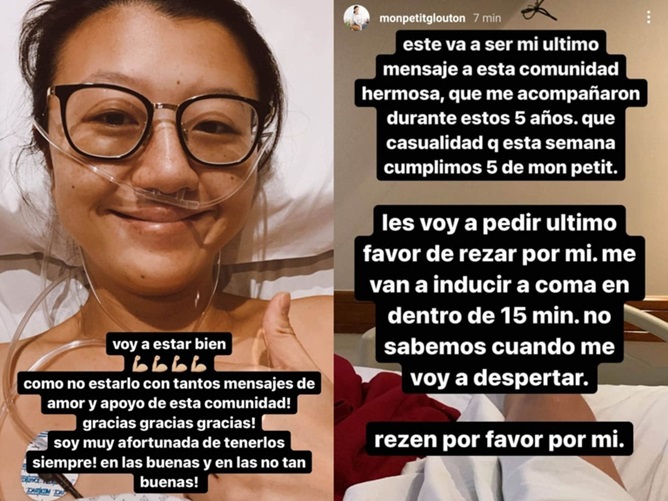 “Este va a ser mi último mensaje a esta comunidad hermosa que me acompañó durante cinco años. Les voy a pedir un último favor, recen por mi. Me van a inducir al coma dentro de 15 minutos y no sabemos cuándo voy a despertar. Por favor recen”, expresó en Instagram junto a una foto desde su cama en terapia intensiva.