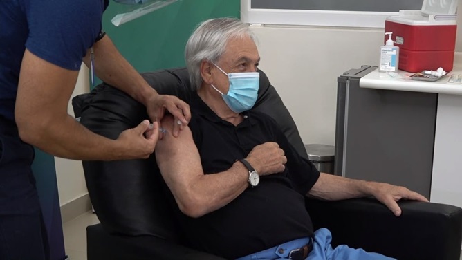 Piñera, de 71 años, fue vacunado en la localidad de Futrono, en el sur del país, donde pasa sus vacaciones. El mandatario recibió la primera dosis siguiendo el calendario oficial de vacunación, que para este viernes consideraba a las personas de entre 71 y 72 años.