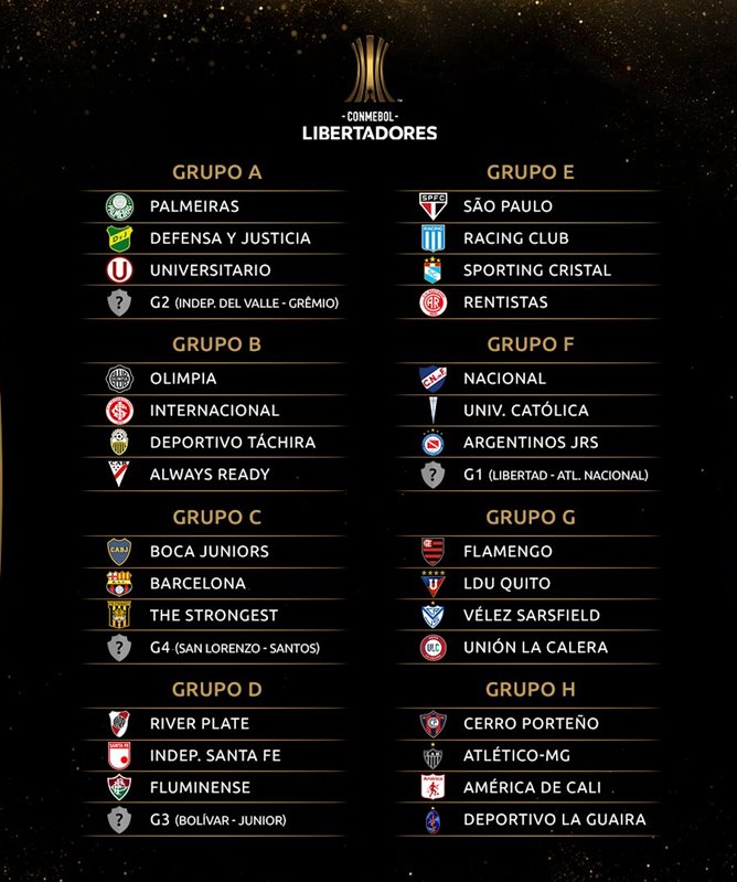 Grupo A: Palmeiras (Brasil), Defensa y Justicia, Universitario (Perú), Independiente del Valle (Ecuador) o Gremio (Brasil).