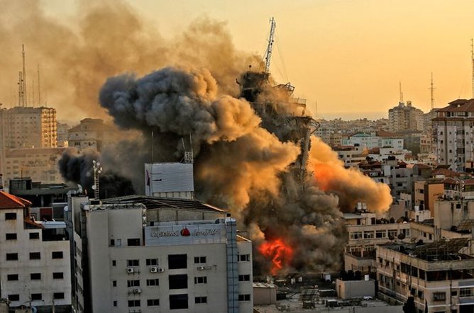 Una periodista que reside en Gaza transmitía en vivo desde una terraza cuando un edificio de 14 pisos frente a ella fue derrumbado por un ataque aéreo israelí, lo que obligó que todo el equipo de trabajo a agacharse para protegerse.