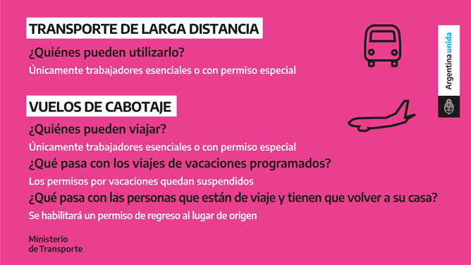 A su vez, los servicios de micros de larga distancia permanecerán funcionando sólo para trabajadores esenciales o para quienes hayan viajado antes de la publicación del DNU y tienen que volver a su casa, constatando el domicilio correspondiente.