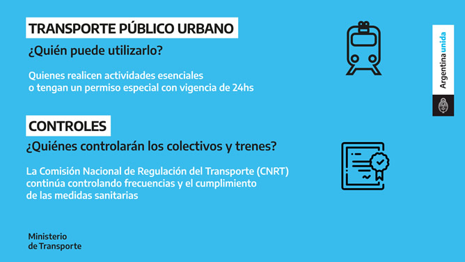 Con el principal objetivo de permitir un distanciamiento social adecuado y cuidar y proteger la salud de cada argentino y argentina, el Ministerio de Transporte de la Nación, a través de agentes de la Agencia Nacional de Seguridad Vial (ANSV) y la Comisión Nacional de Regulación del Transporte (CNRT), acompañan a las fuerzas del Ministerio de Seguridad y fuerzas municipales, en el despliegue de operativos de control en los principales puntos estratégicos para fiscalizar el cumplimiento de las medidas. Las personas esenciales son las que van a poder utilizar el transporte público para concurrir a sus actividades y los permisos especiales deberán tramitarse nuevamente.