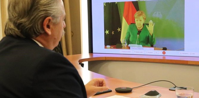 La videoconferencia fue acordada durante la gira de Fernández por Portugal, España, Francia e Italia, a través de una conversación telefónica en la cual Merkel le pidió al jefe de Estado "hacerla en forma remota" desde Buenos Aires "en los próximos días", debido a las restricciones de circulación que hay en Alemania.