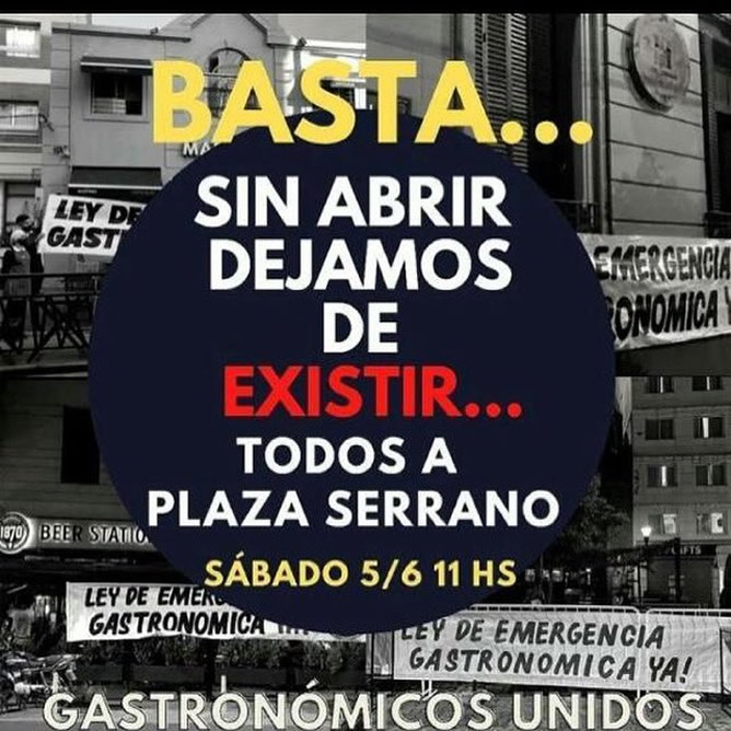 Los gastronómicos instalaron mesas en Plaza Serrano para reclamar por las restricciones actuales, con carteles en los que pedían que se los deje trabajar. El reclamo incluyó una batucada que se hizo sentir en el barrio, sólo interrumpida por el Himno Nacional.