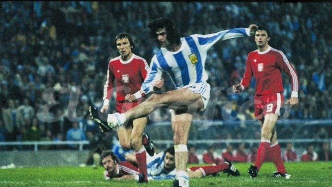 Fútbol: 1978 (43 años) Después de quedar segundo en la ronda inicial del Mundial (detrás de Italia), la selección Argentina le ganó a Polonia por 2 a 0, en el comienzo de una nueva fase. El encuentro se jugó en el estadio Gigante de Arroyito de Rosario y los goles del equipo de César Luis Menotti fueron de Mario Alberto Kempes (los primeros del "Matador" en el torneo). Esa noche también fue figura el arquero argentino, Ubaldo Matildo Fillolo, quien le atajó un penal clave ael jugador polaco, Deyna. Luego la Selección Nacional empataría con Brasil (0-0) y derrotaría por goleada a Perú (6-0), para de esa manera enfrentar a Holanda en El Monumental, en la gran final de la Copa del Mundo.