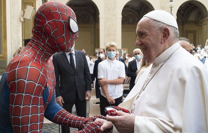 Un tipo diferente de participante se acercó hoy a la audiencia general del papa Francisco en el Vaticano: Spiderman.