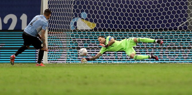 El arquero David Ospina, que en este partido alcanzó las 112 presencias y se convirtió en el jugador con más encuentros en la selección de su país, fue la gran figura de la tanda, al contener los penales de José Giménez y Matías Viña.