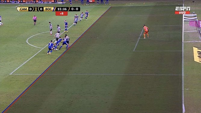 Ocho minutos se interrumpió la acción por esa jugada, que obligó al árbitro uruguayo Esteban Ostojich a revisar todo en el monitor. Sin que nada quede lo suficientemente claro, el juez levantó su brazo y marcó el tiro libre indirecto para el conjunto local.