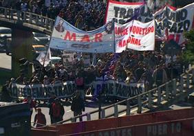 Los manifestantes se dirigieron hacia el corte ubicado sobre la bajada del puente en Avenida Bartolomé Mitre, para después cruzar hacia Ciudad de Buenos Aires y concentrar junto a otras agrupaciones frente al Ministerio de Desarrollo Social.