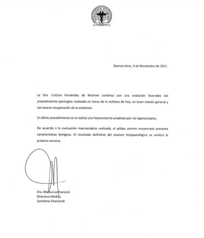 "La Dra. Cristina Fernández de Kirchner continúa con una evolución favorable del procedimiento quirúrgico realizado en horas de la mañana de hoy (por este jueves", comienza el parte firmado por Marisa Lanfranconi, directora médica del Sanatorio Otamendi.