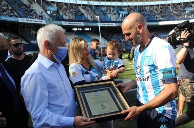 "Vengan, vengan", llamó Lisandro a los suplentes para que también estén en la última foto de él como jugador de Racing. Recibió una plaqueta de parte de la dirigencia y el beso más sincero de su hija Guadalupe.
