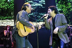 Tras levantar al público con sus canciones más conocidas, como 'Noche de boda' y '19 días y 500 noches' de Sabina, y 'Mediterráneo' y 'Penélope' de Serrat, trataron de concluir su actuación después de dos horas y media, pero no pudieron siquiera abandonar el escenario, donde interpretaron juntos 'Lucía', 'La del pirata cojo' ataviados con una casaca de flores amarillas y 'Que se llama soledad'.