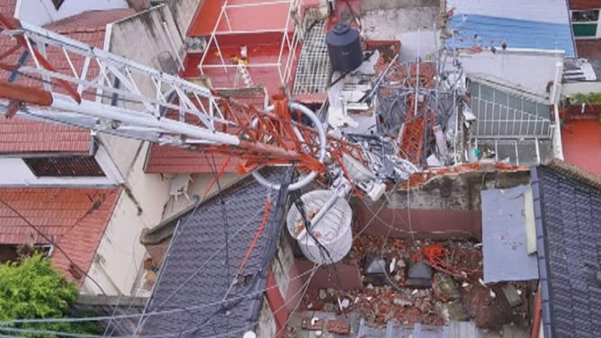 El hecho ocurrió sobre la calle Calderón de la Barca al 900 y aún se desconoce si había personas dentro cuando la fuerza del viento hizo que la antena se desprendiera y cayera sobre los techos.