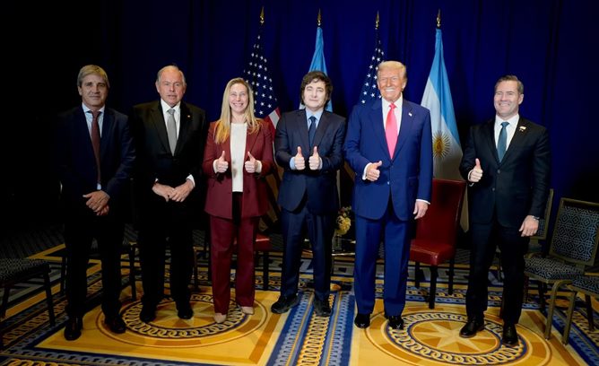 “Hay que hacer a Argentina grande de nuevo. Tenían una inflación desatada. Escucho que estás haciendo un trabajo fantástico, estoy muy orgulloso de ti”, elogió el presidente de Estados Unidos a Milei, que se paró, se golpeó el pecho y sonrió con sus pulgares hacia arriba.