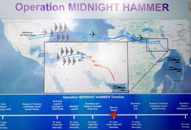 Un mapa proporcionado por el Pentágono de la trayectoria de vuelo de los bombarderos B-2, y de la cronología de la operación, indicó que su aproximación a Irán los llevó sobre el Mediterráneo y después sobre Israel, Jordania e Irak.
