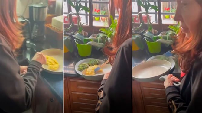 El acto cotidiano destaca a la ex mandataria en la cocina de su departamento del barrio de Constitución en la Ciudad de Buenos Aires, mientras se prepara el desayuno con huevos y palta.