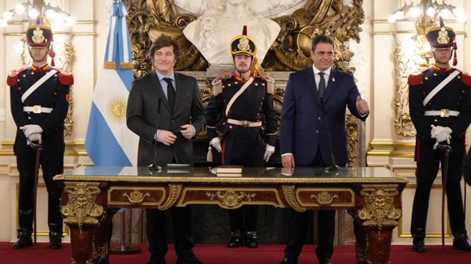 “Somos optimistas en que el futuro del país va a ser bueno”, dijo el flamante ministro, luego de que el mandatario le tomara juramento desde el escritorio ubicado debajo de Escudo Nacional Argentino en el centro del salón.