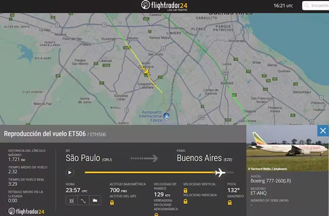 El avión, que cubre la ruta Adís Abeba - San Pablo - Buenos Aires, tomó un rumbo inusual tras ingresar al espacio aéreo argentino.