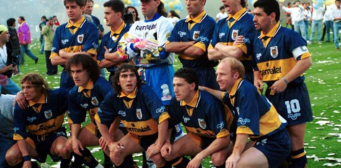 Diego fue el primero en aparecer por el túnel de la Bombonera.La pelota en su mano izquierda mientras se persignaba con la derecha. El mechón rubio. La camiseta azul y oro con detalles, el cuello piqué amarillo, el pantalón azul con bordes amarillos, la cinta blanca con la C de capitán y el auspicio entonces de Parmalat en la espalda, justo por arriba del número 10. Globos y humo a tono.