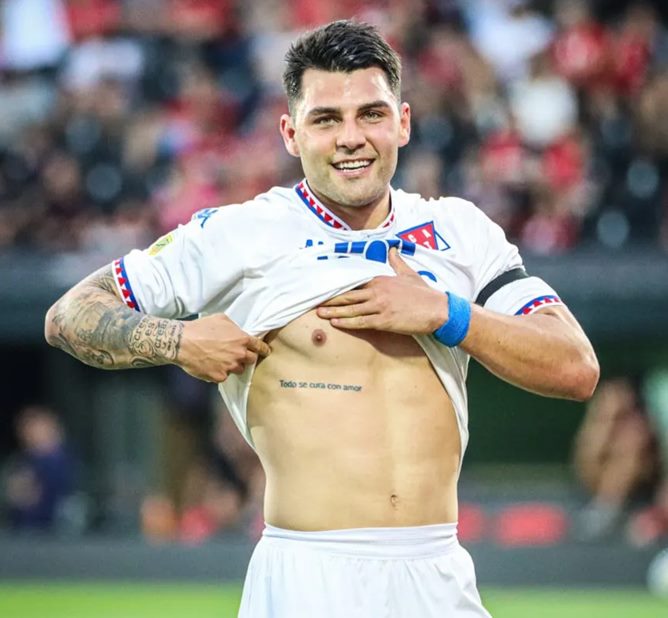 Antes de volver a su mitad del campo de juego para la reanudación de las acciones, el delantero de 24 años levantó su camiseta y mostró su tatuaje en homenaje a su padre: "Todo se cura con amor", una de las frases celebres del mítico DT.