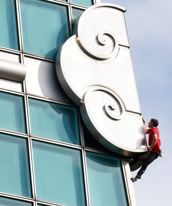 La fase final, considerada la más peligrosa por los organizadores, comenzó al alcanzar la torre superior del edificio, donde los desplomes exigieron toda la fuerza de sus brazos. Desde allí avanzó por los anillos hasta la aguja, rematada por una pequeña esfera metálica suspendida sobre el vacío.