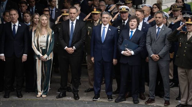 Luego de saludar a su gabinete -presente casi en pleno-, y de abrazar a Adorni, Milei realizó un saludo a la Placa del Soldado Desconocido. Lo hizo acompañado por el jefe de Gobierno, Jorge Macri; el presidente de la Cámara de Diputados, Martín Menem; el ministro de Defensa, Carlos Presti; la ministra de Seguridad, Alejandra Monteoliva y las máximas autoridades de las fuerzas que participaron del conflicto bélico. Allí observaron la colocación de una ofrenda floral frente a las placas con los nombres de los caídos.