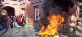 Frente a los restos de la carpa semiquemada, a las 13, comenzaron los incidentes. Primero cayó una de las vallas que rodeaban la Gobernación, luego otra, y muy pronto no quedaba ninguna en pie. Los manifestantes se apoderaron de los jardines y la Policía que custodiaba el lugar retrocedió hasta la puerta: quedaba claro que tenían orden de no reprimir. Los manifestantes más exaltados rompieron vidrios y otros cruzaron algunos golpes con los efectivos. Y a los pocos minutos, el frente del edificio más importante de la provincia era un collage de pintadas. Dos palabras se repitieron: "fuera" y "asesinos".